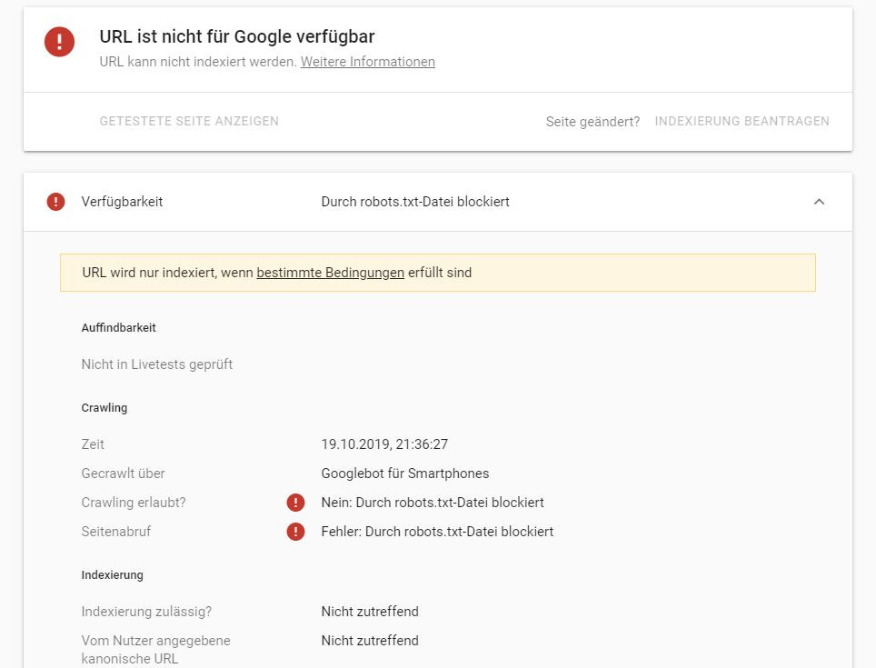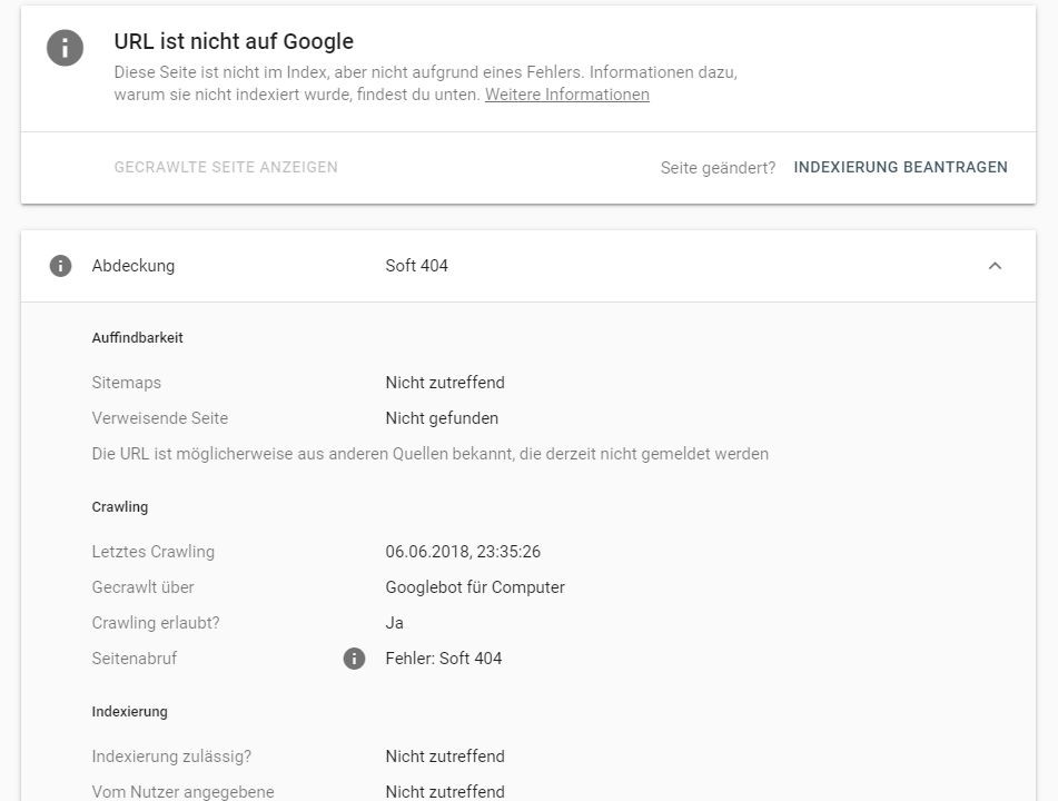 Also wieder ein Soft 404 und die Info, dass die Daten von Mitte 2018 sind. Dann gehe ich oben rechts auf "Indexierung beantragen". Mache ich das, dann kommt das hier: