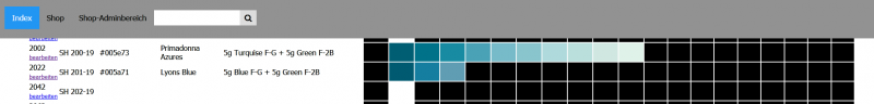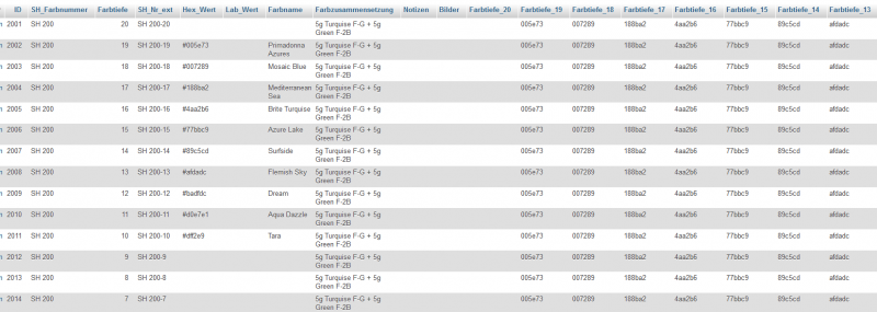 Ich habe ein Formular, in dem ich Werte eingebe: ID (Primary), Farbnummer, Farbtiefe, Hex-Wert der Farbe (Nach html-Schema: #AABBCC) und noch anderes mehr.