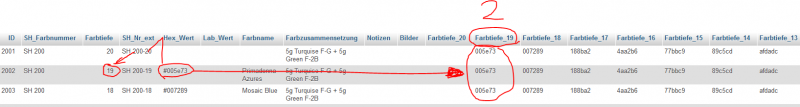 Dann müssen alle Farbtiefe_10-Felder, wenn sie die Farbnummer SH 100 haben, in der DB mit dem gesendeten Hex_Wert auch upgedatet werden.