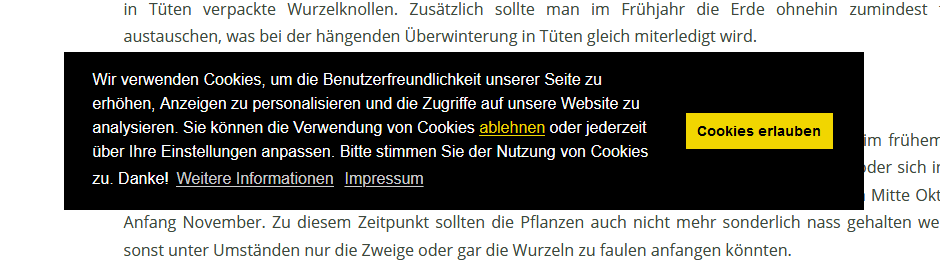 Warum Mobil-Nutzer? Meine Meinung: Der Hinweis füllt auf dem Smartphone ca. 50% des Display, also muss der schnell weg. Auf dem Desktop sind es nur wenige Zentimeter am unteren Rand, kann man da lassen, stört nicht weiter. Auch merke ich, dass es weit verbreitetes Design sehr wichtig ist. Also dieses "schwarz mit gelben Button" oder auch das graue Design vom anderen Anbieter. Warum ich das meine? Weiß ich durch Tests auch weiß, dass das mehr oder weniger eine Reflexreaktion ist und der gelbe Button gedrückt wird. Es ist egal, aber der "ja" oder "nein" ist, Hauptsache gelb, es wird geklickt. Selbst wenn auf dem was in chinesisch steht wird der geklickt. Scheint also wirklich so zu sein. Hauptsache schnell weg mit dem Hinweis und "gelber Button" ist bei jeder zweiten Seite so, also gewohnt.