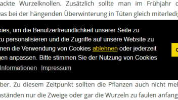 An den Cookies für die Zustimmung muss man wohl aber auch noch arbeiten, also nicht an der Optionen-Auswahl, die fehlt ja eh, sondern an der Umsetzung. Die Cookies laufen normalerweise ja 365 Tage, dann muss neu bestätigt werden. Das ist schon wieder ein mögliches Hindernis. Also eventuell automatisch verlängern, ohne dass der Nutzer das merkt. Ein Problem dabei (und daher das automatisch verlängern) ist der Browser Safari. Das ganze aber nur als Gedankengang, so wirr er auch ist. Safari lässt keine Langzeitcookies mehr zu, wenn ich richtig informiert bin. Das Limit liegt hier seit Anfang des Jahres bei maximal 7 Tagen. Wen man also 7 Tage lang nicht mehr auf der Webseite war, dann wird das Cookie gelöscht, auch wenn es eigentlich 365 Tage gültig ist. Wenn aber ein Nutzer 7 Tage nicht da war, dann kann man es auch nicht verlängern, daher "wirrer Gedankengang". Vielleicht umsteigen auf LocalStorage oder IndexedDB, die scheinen noch nicht limitiert zu sein.
