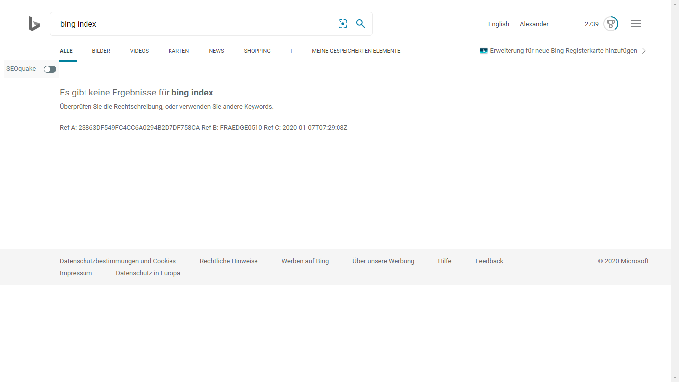 • Bing scheint ein Problem heute zu haben. Komplette Indexe von verschiedenen Querys sind komplett gelöscht. Rank Tracker sagt das etwa 90% komplett wech sind, also die Keys. Manuelle Prüfung ergab das nix ausgeliefert wird.