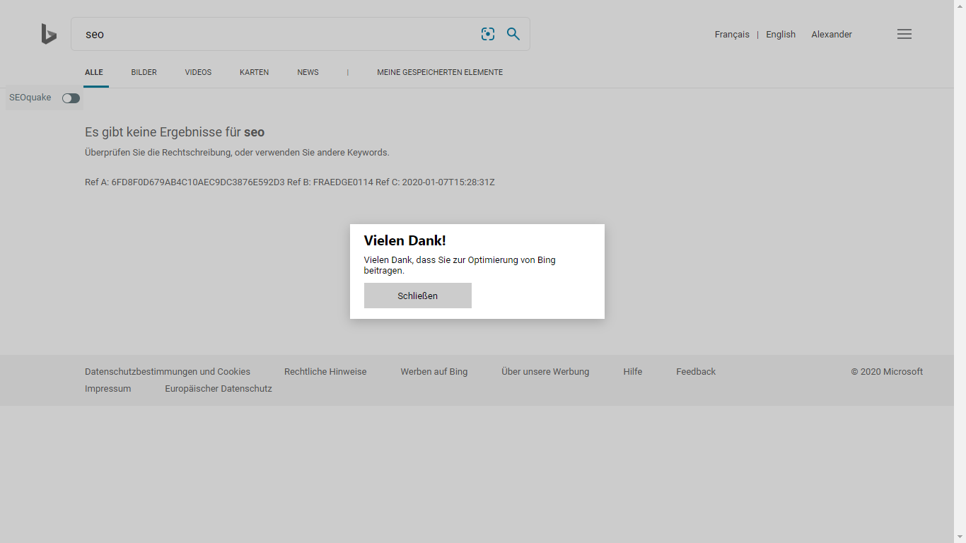 Da hatte ich meine ich auch mal Microsoft direkt angeschrieben von Bing. Habe auch eine Standard Antwort erhalten das die nicht zuständig sind. Da ging es auch um den Bing-O-Mat. Dann zur Pressestelle um Antwort gebeten, leider keine Antwort erhalten.