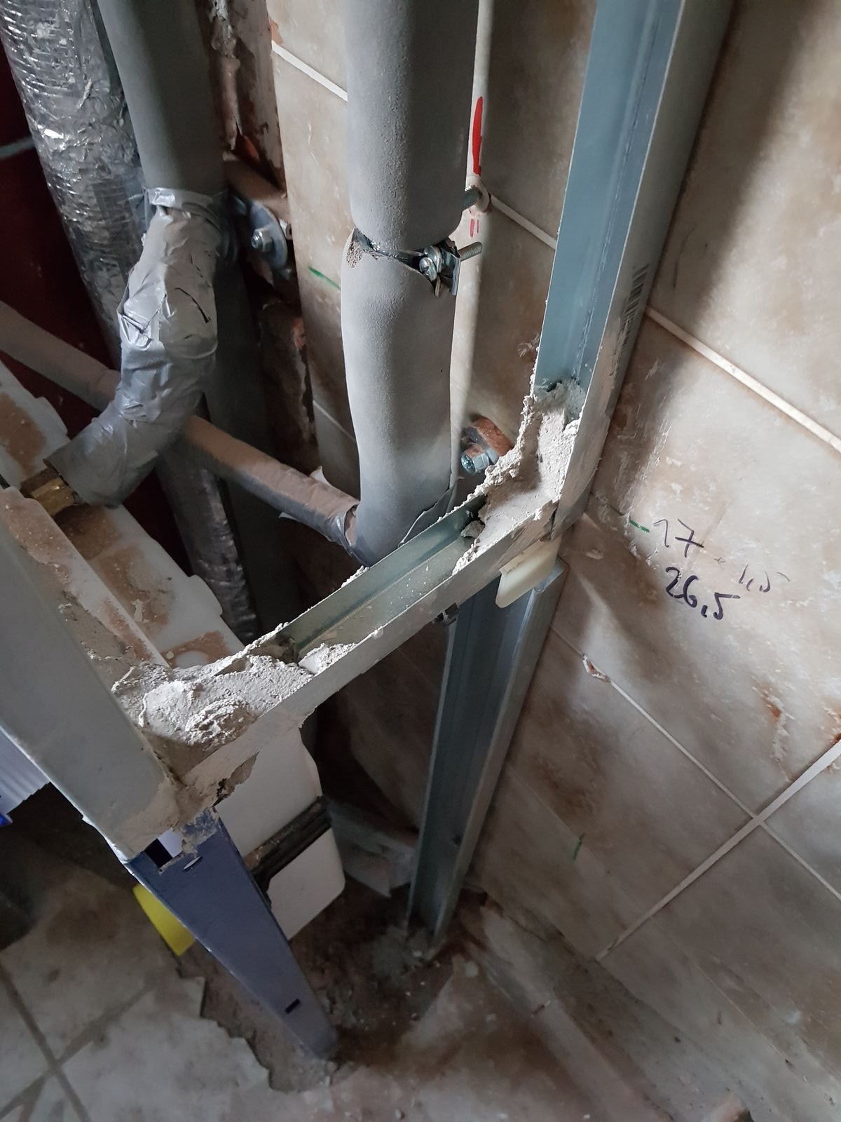 Und Jandre, weil sich die HV gestern beschwerte, das WC würde zu weit in den Raum stehen, machte nun auf Anordnung keinen Vorbau mit Trockenbau um das WC-Gestell rum, sondern klebt seine Profile mit Fliesenkleber auf das Gestell. Na ob das halten wird?
