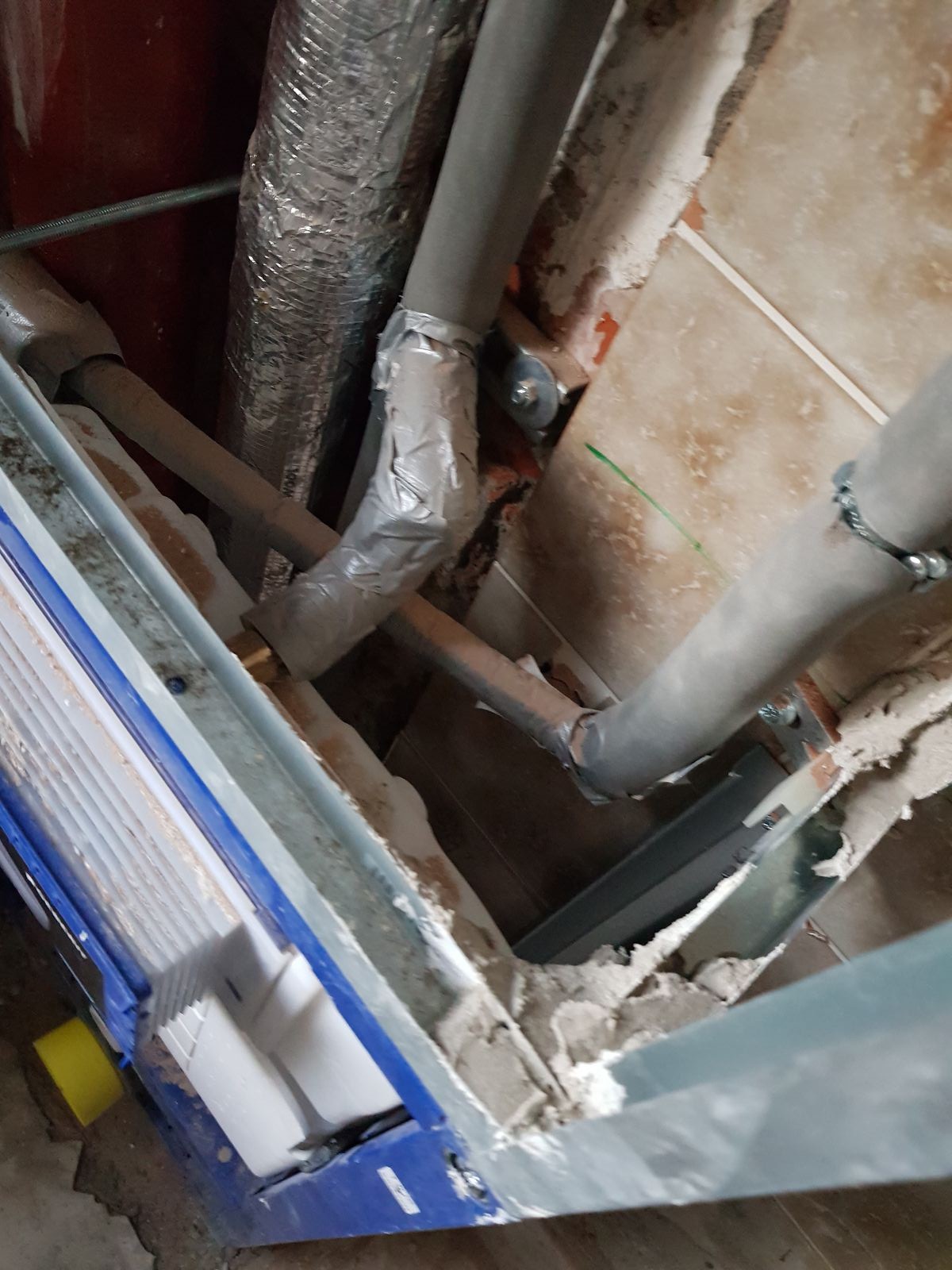 Auch witzig, an der Stelle, wo der Schaden ist, hing vorher ein Schrank. Der Schacht war gemauert. Nun ist es eine Wedi-Platte. Klasse, wie macht man da einen Schrank fest? Irgendwie denken die alle nur von Tapete bis Kleister.