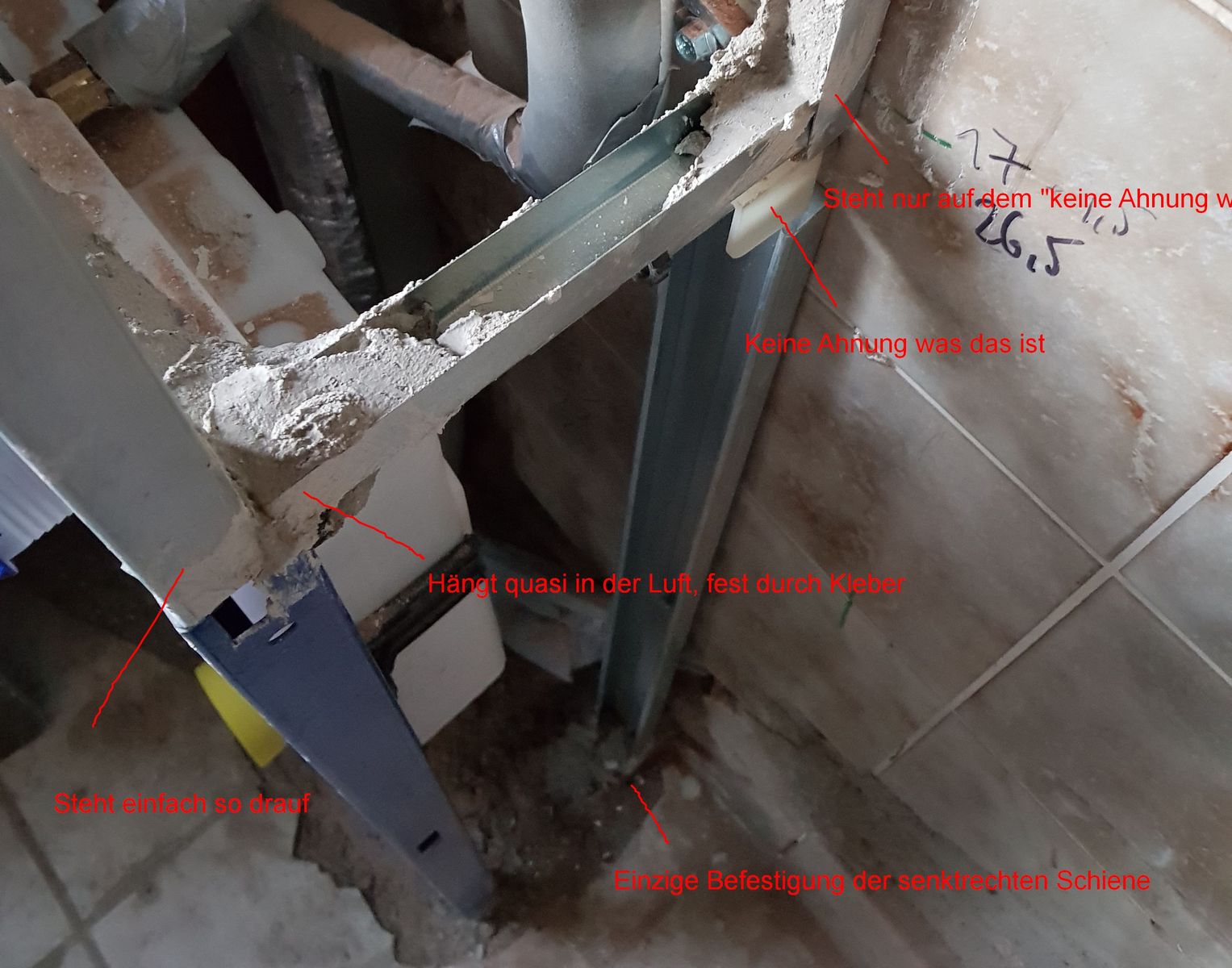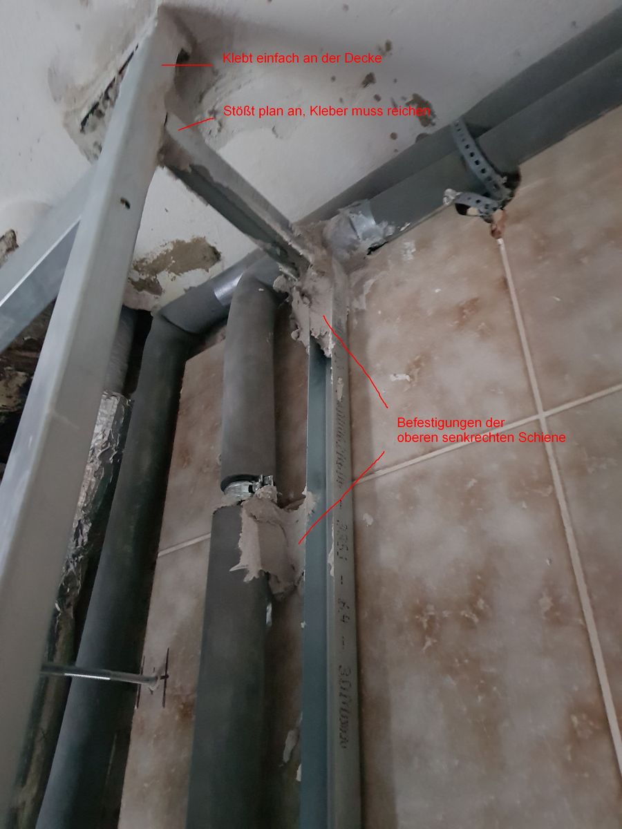 • Bei den Fotos einfach auf die Ecken achten. Die ganzen Schienen sind nicht mit Schrauben fest, sondern gegenseitig an den Stößen mit Fliesenkleber verklebt. Unten auf dem blauen Geberit-Gestell liegen und stehen die auch nur drauf, eben auch mit Kleber fest. Und oben schaut es so aus ;)