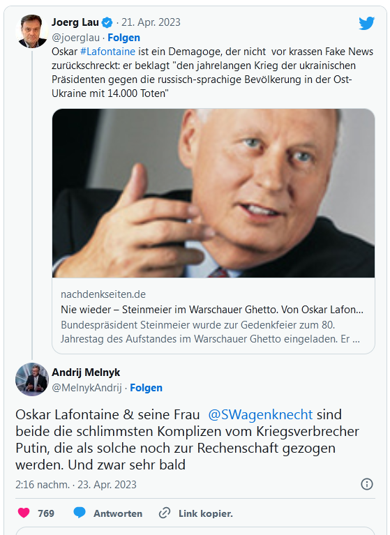 Als ich das gestern mitgekriegt habe dachte ich auch, dass das nicht wahr sein darf. Dieses Grossmaul Melnyk droht einer deutschen Abgeordneten unverhohlen mit Strafmassnahmen und in der deutschen Politik kriegt keiner den Mund auf. Figuren wie dieser Lau zeigen überdeutlich wie tief die Presseheinis in ihrem Kadavergehorsam mittlerweile gesunken sind, und das meist ohne jede Not. Keine Ahnung, wie die das mittlerweile verspielte Vertrauen je wieder wiederherstellen wollen.