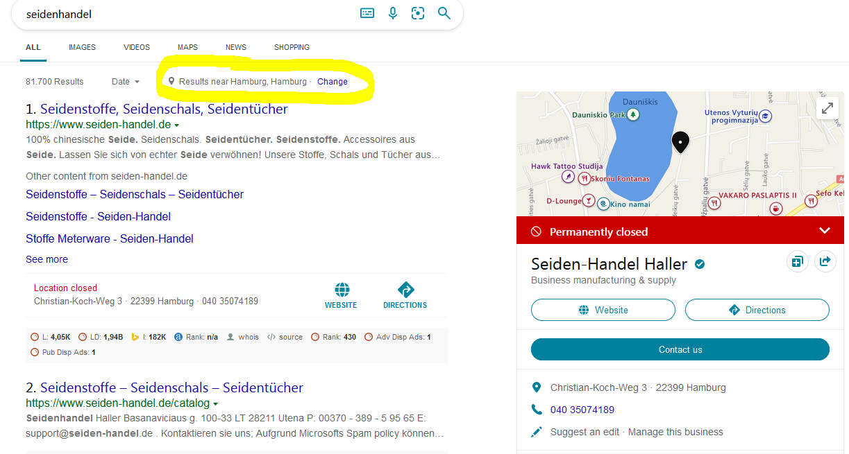 Bing zeigt bei einer Suche nach mir meine alte private Wohnadresse und nen fetten roten Balken "Geschäft dauerhaft geschlossen".