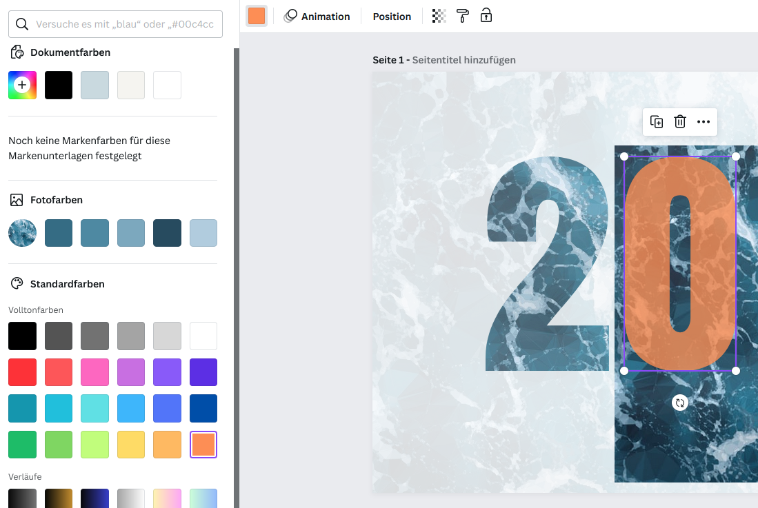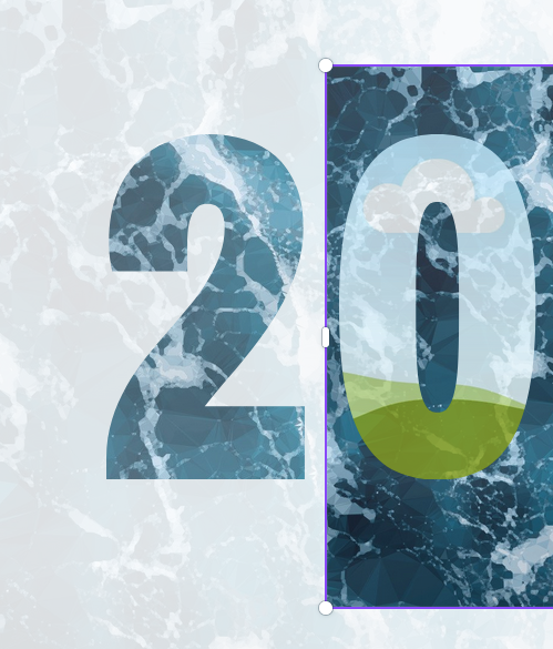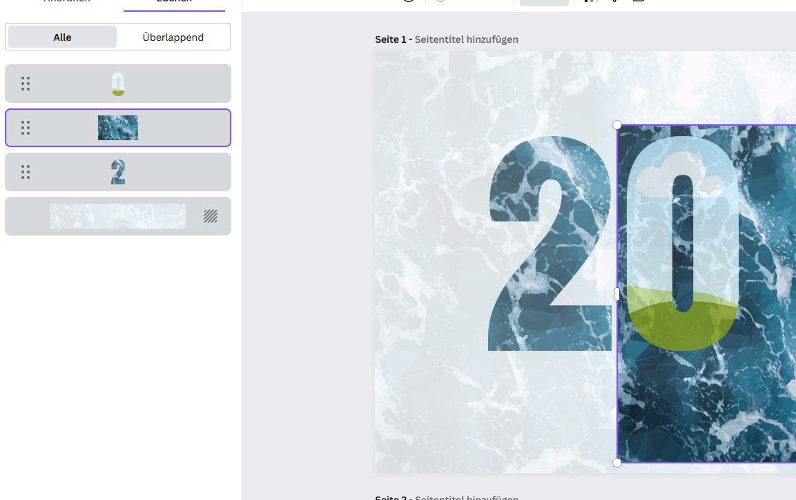 Das ist ein transparentes Element, das ich daneben auch als 0 habe. Dann ist diese transparente 2 mit einem Hintergrund gefüllt. Den habe ich auch, liegt hinter der 0. Wie bekomme ich die beiden nun zusammen? Also so zusammen, dass nur die Zahl mit dem Hintergrund gefüllt wird und nicht das ganze Dokument.