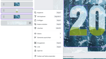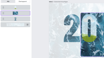 Wenn ich hergehen, die 2 markiere und dann im Kontextmenü sage "Bild trennen", dann werden daraus zwei Elemente. Die transparente zwei und dahinter als eigenes Objekt (rechteckig) der blauen Hintergrund. Also dann genau so, wie es rechts mit der 0 ist. Ich bekomme die quasi auseinander, aber nicht mehr zusammen.