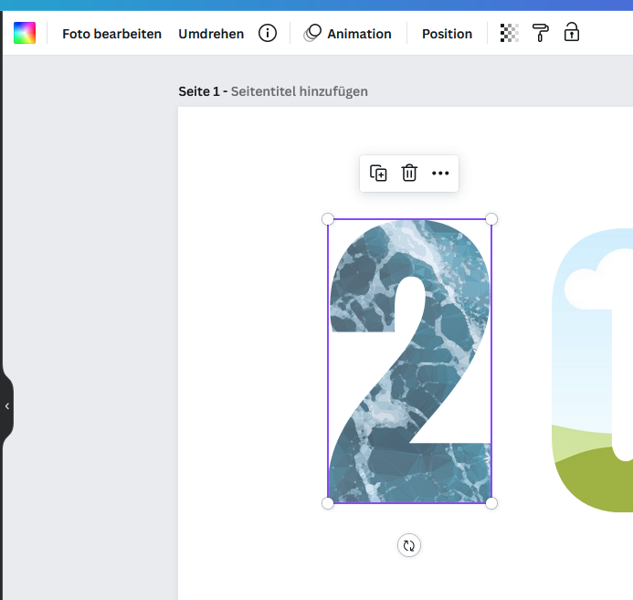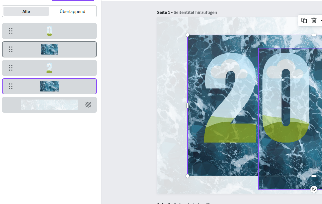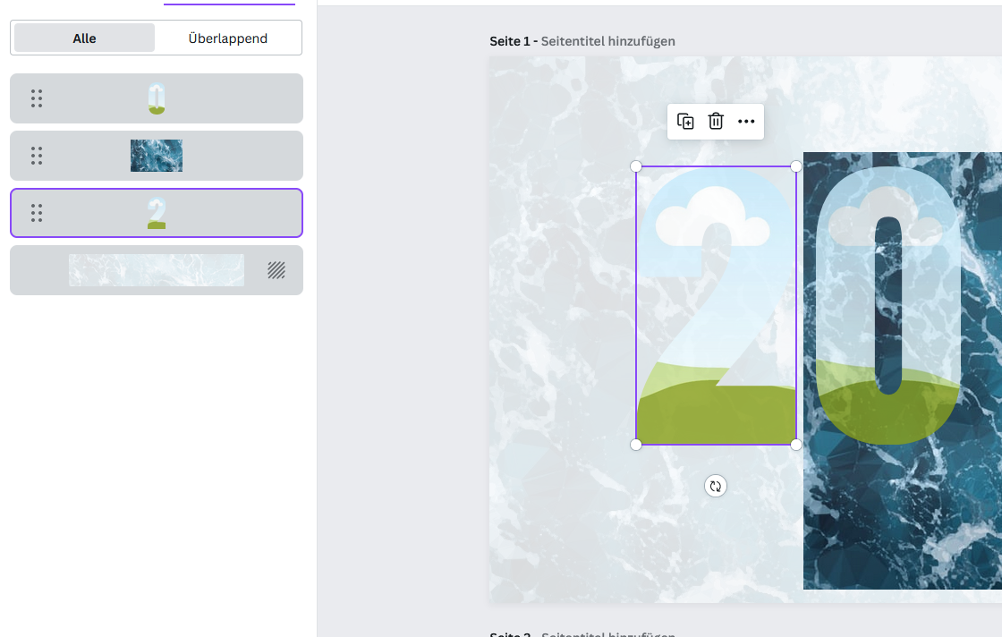 Wenn ich die 2 da anklicke und lösche, dann verschwindet nur die blaue Füllung, also das blaue Bild darin. Die 2 selbst ist dann wie die 0, hellblau mit der Wolke oben und dem grün unten. Nur durch ein nochmaliges löschen ist dann auch die transparente 2 weg.