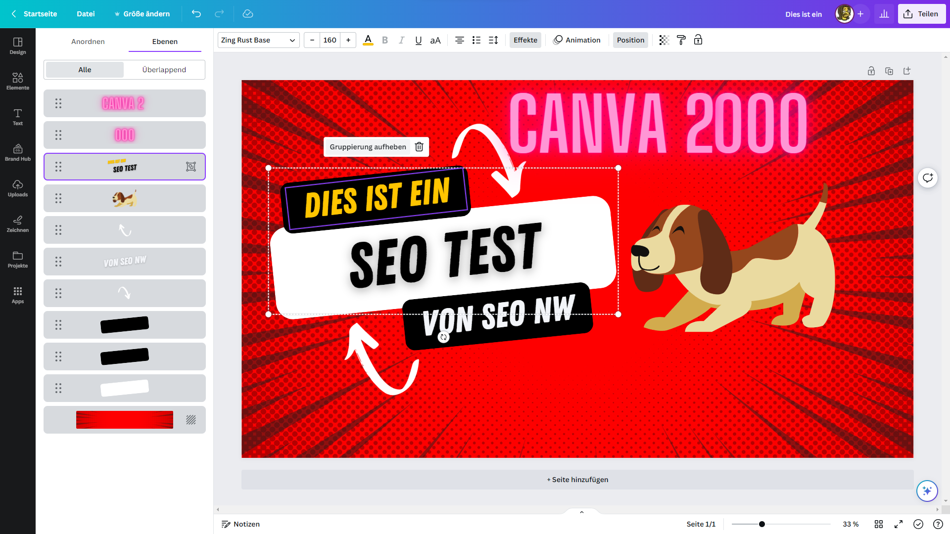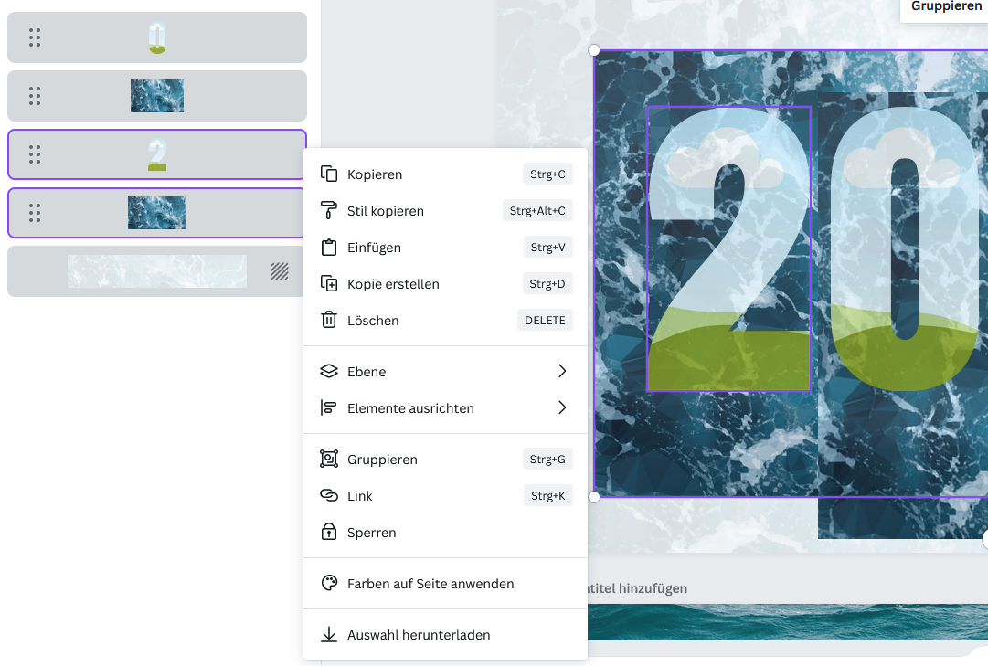 Und wenn ich dann beide Ebene markiere, dann kommt eine neue Option "Gruppieren". Die ist es aber nicht. Da bleibt die Ansicht dann so wie sie ist, nur dass eben beide verbunden sind und sich nur noch gemeinsam verschieben oder in der Größe ändern lassen.