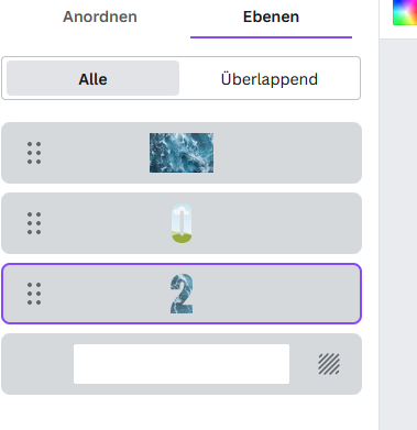 so, nochmal die Ebenen. Da schaut hier so aus. Drei Ebenen, die 2, die 0 und das blaue Bild