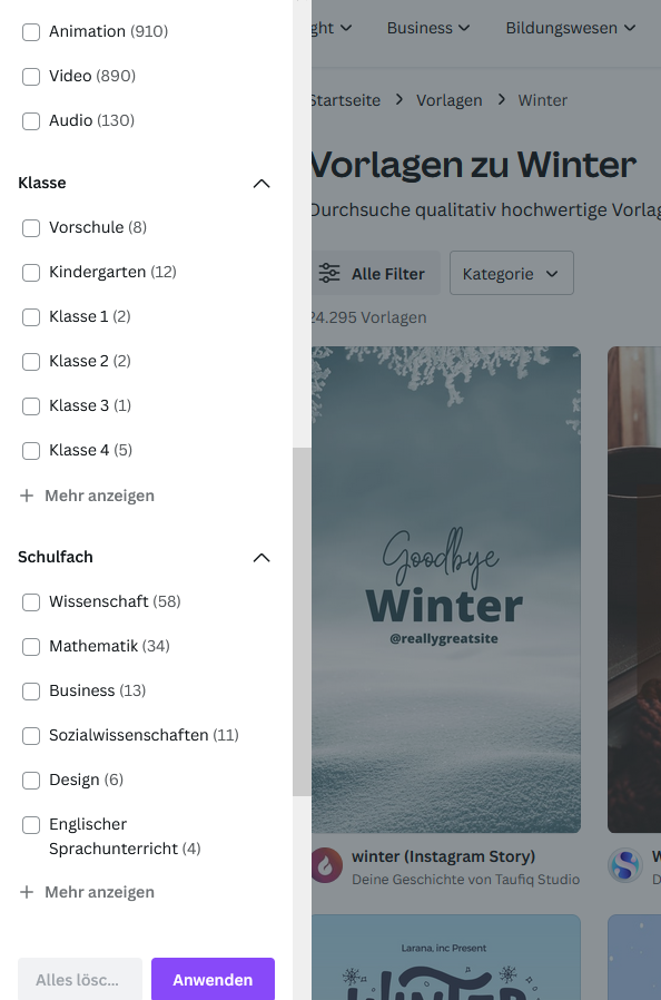 Und da gibt es oben ja die "Filter ...." Da ist alles mögliche drinnen, vor allem tausend Schlagwörter und Co, aber keine Ausrichtung oder Vorlagen-Größe. Nur Vorlagen im Sinne von Insta, Facebook, Kaffetasse etc. Das einzige, was ich noch mit 16:9 finde ist "Video", aber das möchte ich ja nicht. Eine "Schulklasse" oder ein "Schulfach" kann man aber filtern. Hä? Ich suche "Vorlage zu Winter in Größe xy" und nicht "Vorlage XY für Instagram für Schüler der 3. Klasse Mathematik".