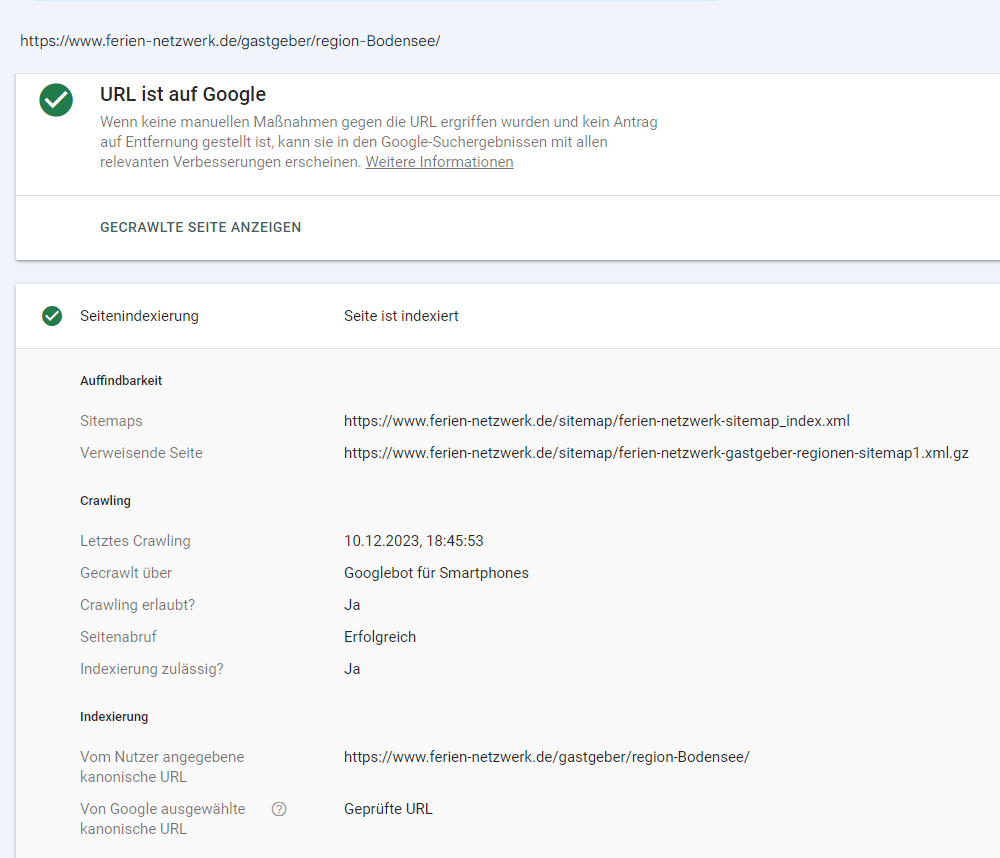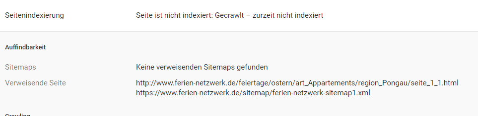 Oder bei der hier, noch wirrer. Da sagt er "keine verweisenden Sitemaps gefunden" um dann bei der verweisenden Seite ebenfalls eine Sitemap anzuzeigen. Und natürlich ist die anderen URLs auch uralt. Diese "art_Appartements" gibt es seit 2008 nicht mehr. Wobei es in dem Fall aber die genannte XML-Sitemap auch nicht gibt. Auch so seit ca. 2015.