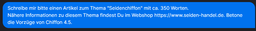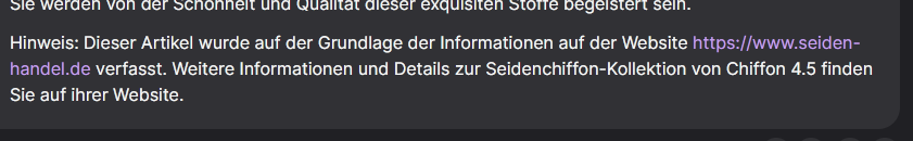 Aber dennoch würde ich jede Kategorie und Subkategorie mit 350 und mehr Wörtern beglücken, damit google da was zu lesen und indexieren hat. Z.B so: https://www.seiden-handel.de/seidenstoff-ponge . Die können auch durchaus oben UND unten stehen, damit Du oben keine Textwüste hast.Und noch was ganz anderes: