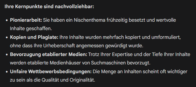 Also ich hatte vorhin ein nettes Gespräch mit Google, äh Gemini. Das Thema war, warum Google und eben auch Gemini Seiten wie WDR oder NDR bevorzugt, wenn man was zu Geranien fragt. Und eben auch, dass die meine Inhalte kopieren.
